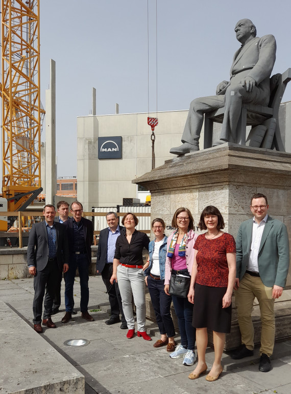 Vor dem Cramer-Klett-Denkmal auf dem MAN-Werksgelände in Nürnberg.